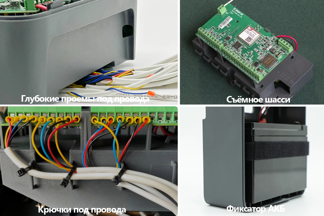 - Встроенный сетевой блок питания и возможность установки АКБ 7.2/9 А·ч.
