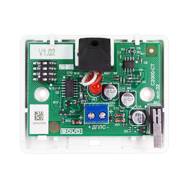 Под съемной крышкой извещателя расположена печатная плата, на которой размещены органы коммутации и управления: