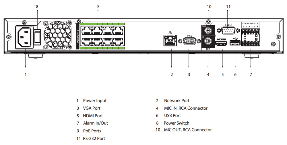 • Потребляемая мощность: Общая выходная мощность NVR составляет ≤ 10 Вт (без жесткого диска).