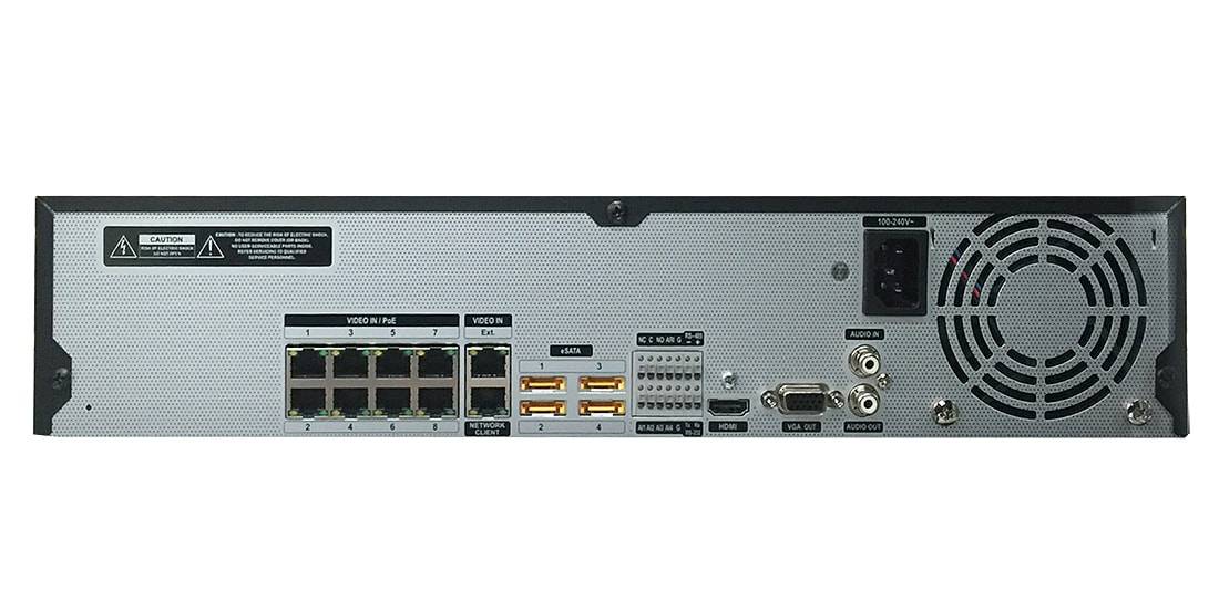 • Подключение камер: Гигабитный Ethernet (Клиент) x1 + Гигабитный Ethernet (IP камеры) x8 + Гигабитный Ethernet (Внешний) х1