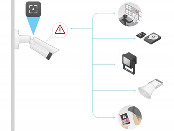 Это приложение интегрируется с системой управления камеры, которая в ответ на сигнал тревоги отправляет уведомления по электронной почте, направляет поток видео в систему ПО для управления видео, записывает видео на карту памяти и запускает внешние устройства через выходные порты камеры.