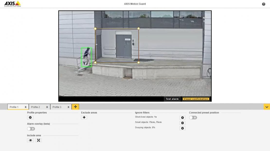Приложение AXIS Video Motion Detection 4 поддерживает несколько профилей, позволяющих создать несколько конфигураций; так, одна конфигурация может быть для дневного, а вторая — для ночного времени, либо это могут быть конфигурации с разными зонами наблюдения. Каждый профиль запускает собственные сигналы тревоги и имеет собственные настройки.