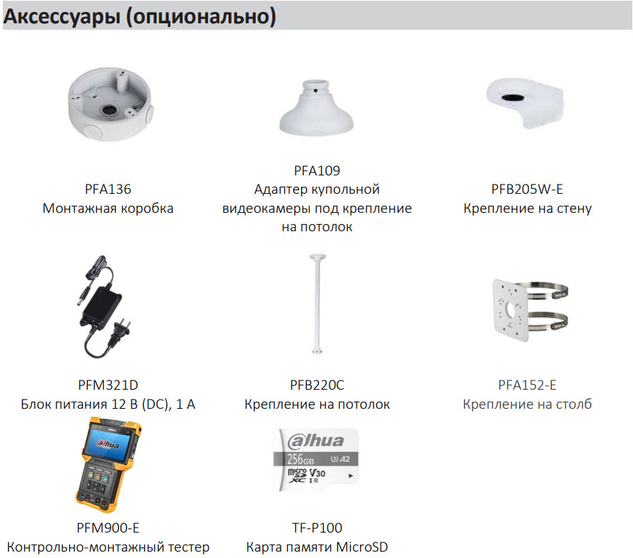 • 1 тревожный вход, 1 тревожный выход; 1 аудиовход, 1 аудиовыход; MicroSD до 256 Гбайт; встроенный микрофон