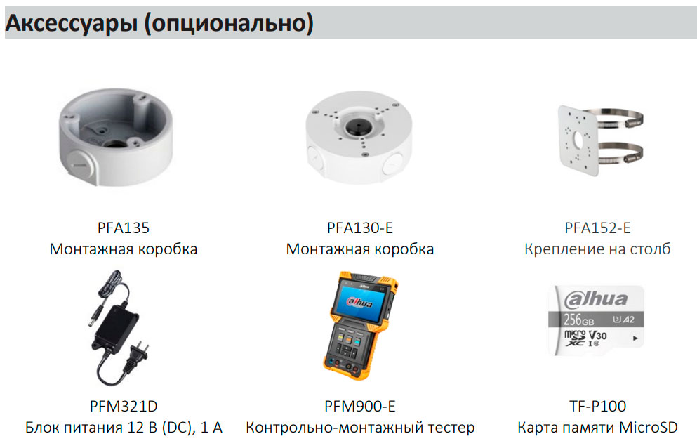 • 1 тревожный вход, 1 тревожный выход, 1 аудиовход, 1 аудиовыход, MicroSD до 256 Гбайт, встроенный сдвоенный микрофон, встроенный громкоговоритель, двухсторонняя аудиосвязь