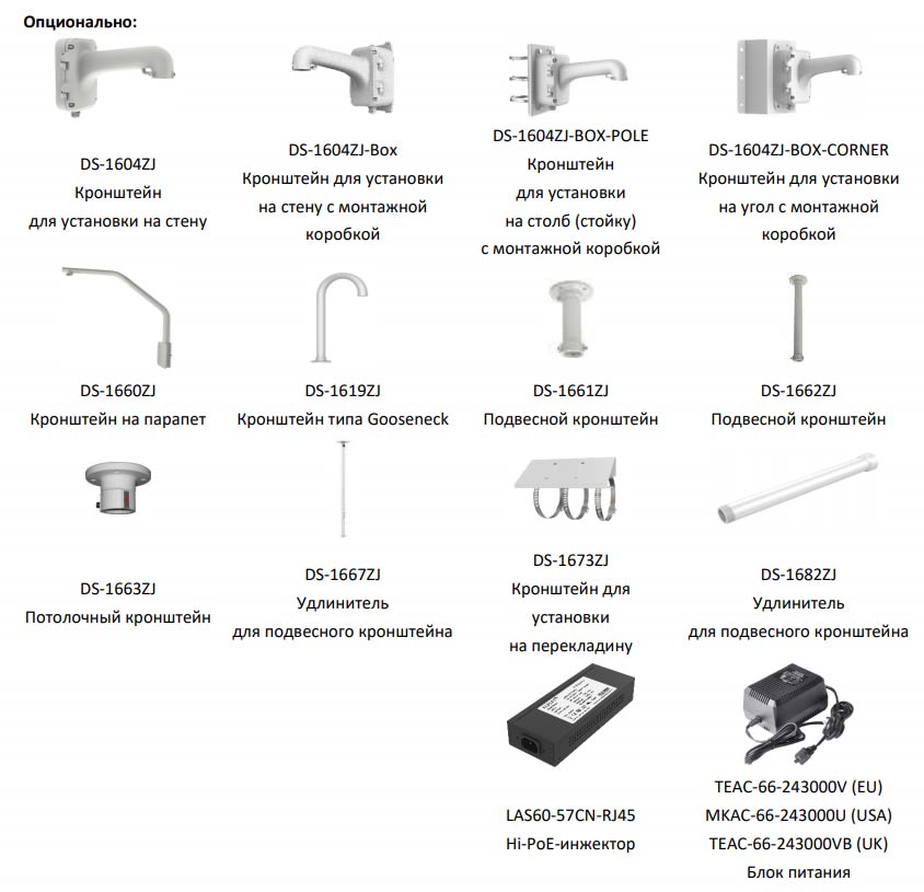 • Питание: AC 24 В, 3.0 А, 50/60 Гц, AC (макс. число 60 Вт), Hi-PoE, от 42.5 до 57 В, 1.41 А (макс. 50 Вт). Всего 60 Вт, включая макс. 18 Вт для ИК-подсветки и макс. 6 Вт для обогрева