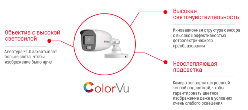 Главная особенность камер с применением этой технологии в том, что при минимальном освещении, или при его полном отсутствии, формируется цветное изображение. Этим камеры отличаются от большинства других моделей, которые в темноте формируют черно-белое изображение с помощью ИК-подсветки. В камерах ColorVu вместо ИК-подсветки используется мягкая и неослепляющая LED-подсветка, которая и формирует цветное изображение. Исходные цвета объектов не искажаются. В камерах работает автоматически настраивающийся алгоритм трехмерного шумоподавления, за работу которого отвечает независимый процессор ISP.