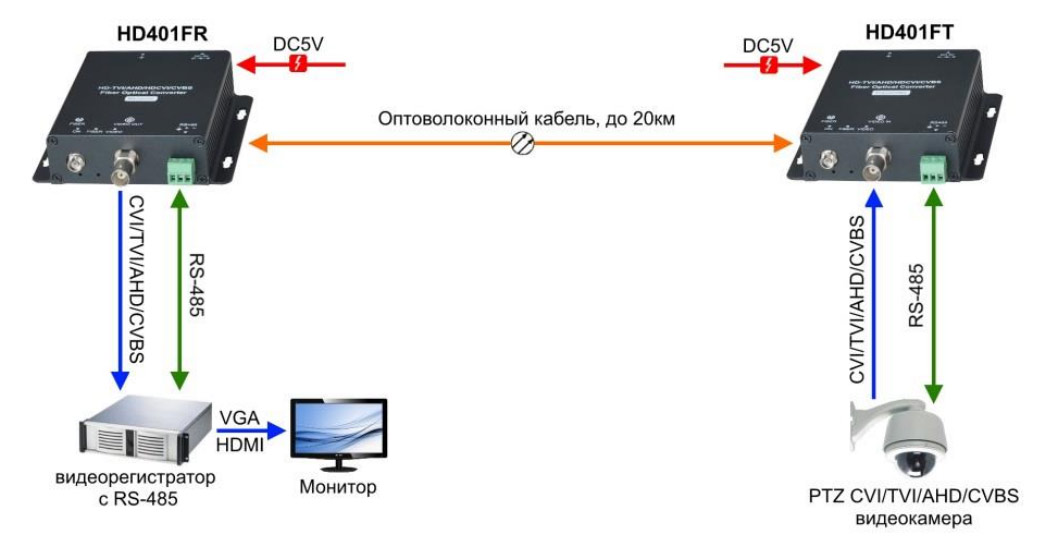 Данный комплект предназначен для передачи видеосигнала HDCVI/HDTVI/AHD/CVBS и сигнала управления RS485 по одномодовому оптоволоконному кабелю на расстояние до 20км.