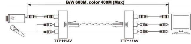 TTP111AV - приемопередатчик видео и 2аудио сигнала по витой паре на 600 м., имеет 1 канал под BNC, 2 под RCA, витая пара под RJ45.