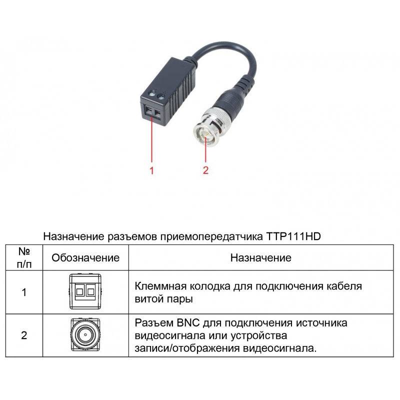 Пассивный приёмопередатчик HDCVI/HDTVI/AHD по витой паре до 300м(720p)/250м(1080p)/200м(4Mpix)/150м(5Mpix), до 500м(5Мpix)(в паре с активным передатчиком TTA111HDT). Полоса пропускания до 60МГц. Вх. - BNC на гибком кабеле 10см. Вых. - Клм.(2pin).