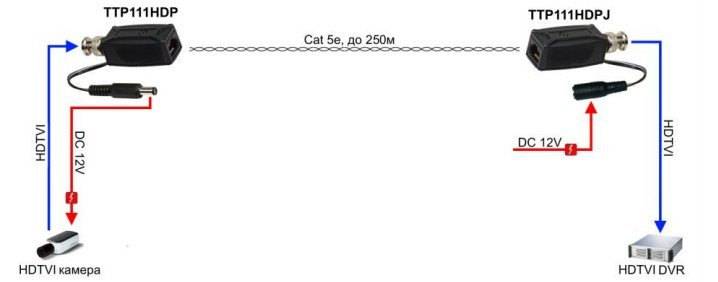 Комплекты TTP111HDPK и TTP111HDP-LK с успехом могут быть использованы в системах аналогового видеонаблюдения высокой четкости, когда нет возможности запитать видеокамеру на месте ее установки. Кроме того, комплекты используют для подключения более простой в монтаже и более помехозащищенный кабель «витой пары».