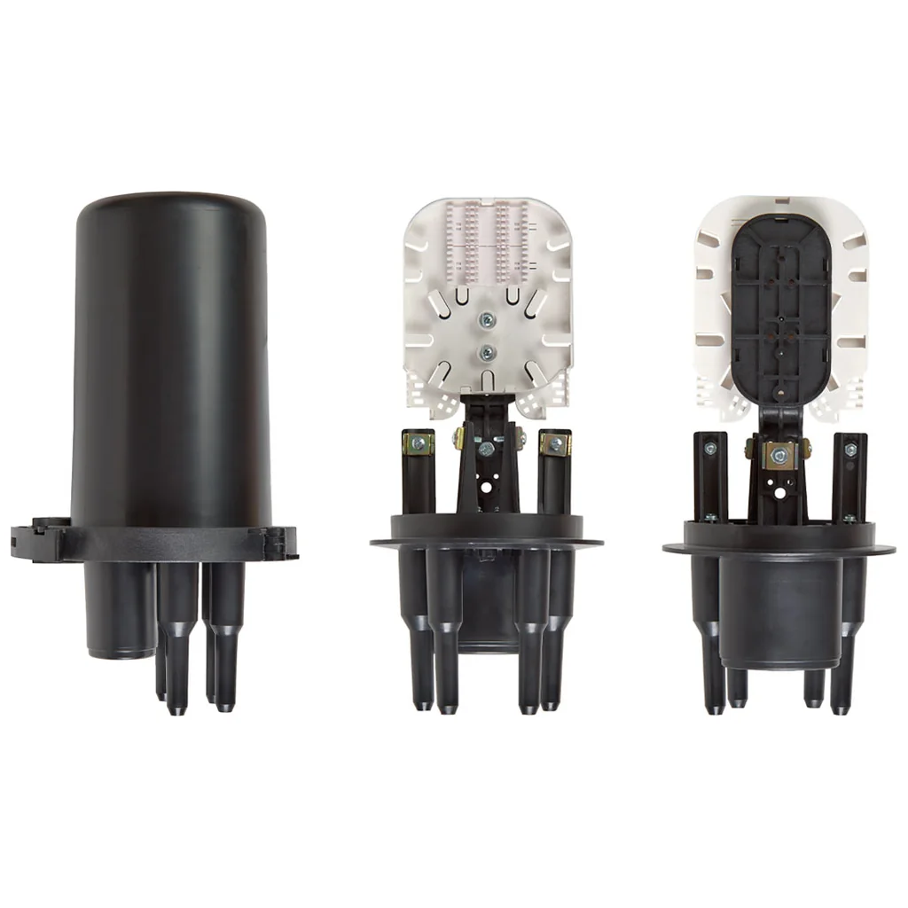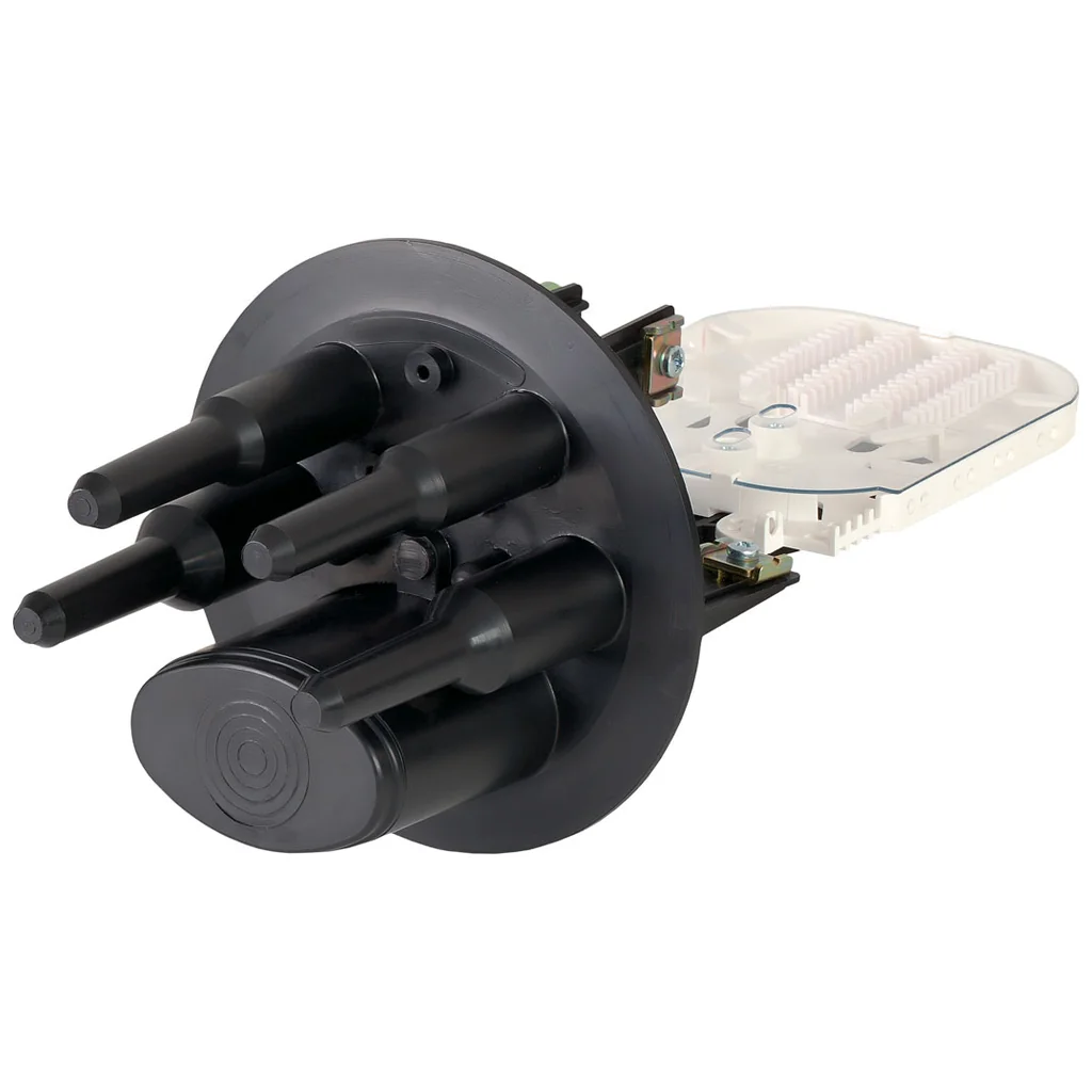 Инженеры реализовали в модели технологию ступенчатых вводов: два круглых порта до 20 мм, два до 16 мм и один овальный транзит до 25 мм, что упрощает разделку кабелей разных диаметров без дополнительных переходников. Герметизация достигается благодаря комбинированной системе «хомут + ТУТ»: наружное кольцевое зажимное устройство плотно стягивает кожух, а термоусаживаемые трубки обеспечивают надёжную влагозащиту вводов. Такая схема выдерживает давление и полностью исключает проникновение пыли, влаги и конденсата, поддерживая стабильные оптические характеристики линии на протяжении всего срока службы.