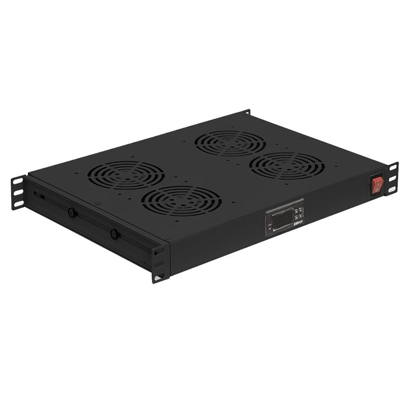 19" вентиляционная панель с аналоговым термостатом для телекоммуникационных шкафов любых производителей, 1U, 4 вентилятора, цвет - черный.