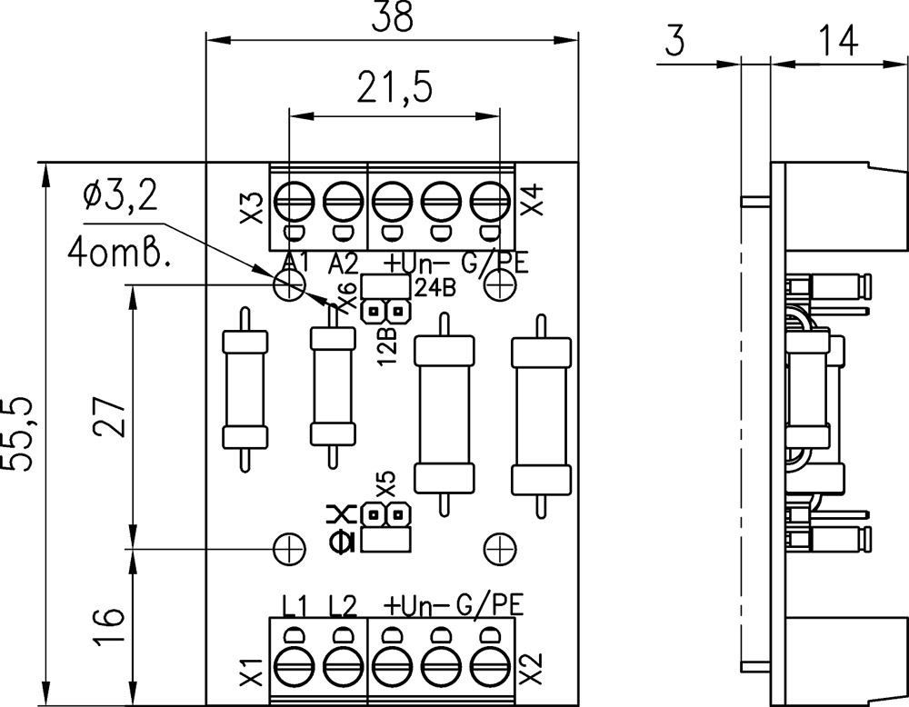 Конструктивно УЗЛ-7,5/10кА-12(24)В выполнено в виде печатной платы, что позволяет размещать его непосредственно в корпусе защищаемого устройства.