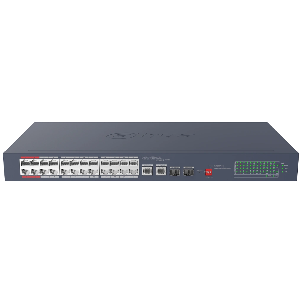 - 28-портовый коммутатор: 24 × RJ-45 PoE + 2 × RJ-45 uplink + 2 × SFP uplink.