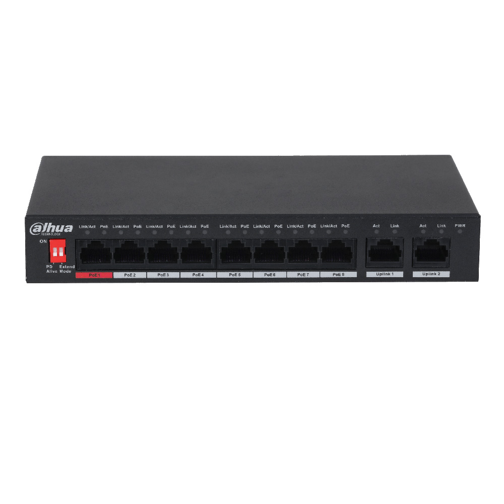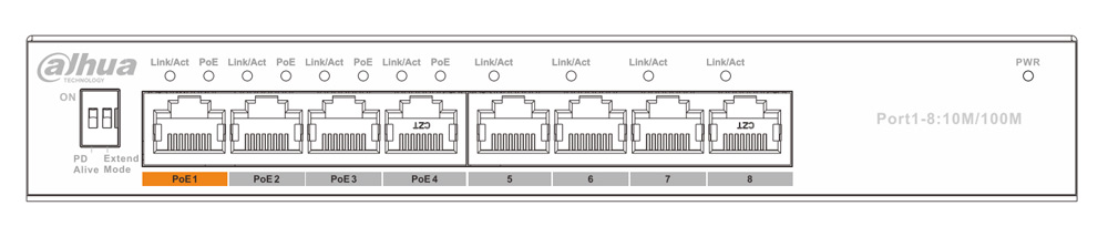 DH-PFS3008-8ET-60 — это неуправляемый настольный коммутатор с 4 портами PoE 10/100 Мбит/с. Коммутатор оснащен 8 портами Ethernet 10/100 Мбит/с. Изделие оснащено двумя типами режимов передачи (расширенный режим включен/расширенный режим выключен). Порт Orange поддерживает стандарты Hi-PoE.