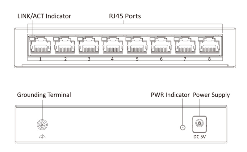 Коммутатор выполнен в компактном и прочном металлическом корпусе с безвентиляторным охлаждением. Благодаря своим размерам модель может легко размещаться прямо на рабочем столе, обеспечивая быстрый доступ к портам. Кроме того, модель оснащена светодиодными индикаторами на лицевой панели, с помощью которых вы сможете наглядно следить за состоянием работы устройства. В качестве источника питания коммутатор использует сеть 220 В. Для подключения к ней в комплекте предусмотрен адаптер питания.