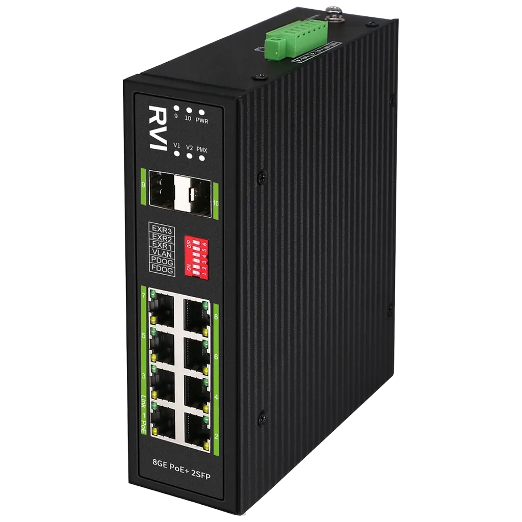 Сетевой коммутатор RVi-1NSI8GP-2S предназначен для построения отказоустойчивых сетей передачи данных в промышленных и уличных условиях. Благодаря поддержке стандартов PoE вплоть до 90 Вт на порт, устройство способно питать энергозависимые устройства, такие как IP-камеры, точки доступа и терминалы. Прочный металлический корпус, индустриальное исполнение и пассивная система охлаждения позволяют использовать коммутатор в условиях повышенной температуры, влажности и пыли.