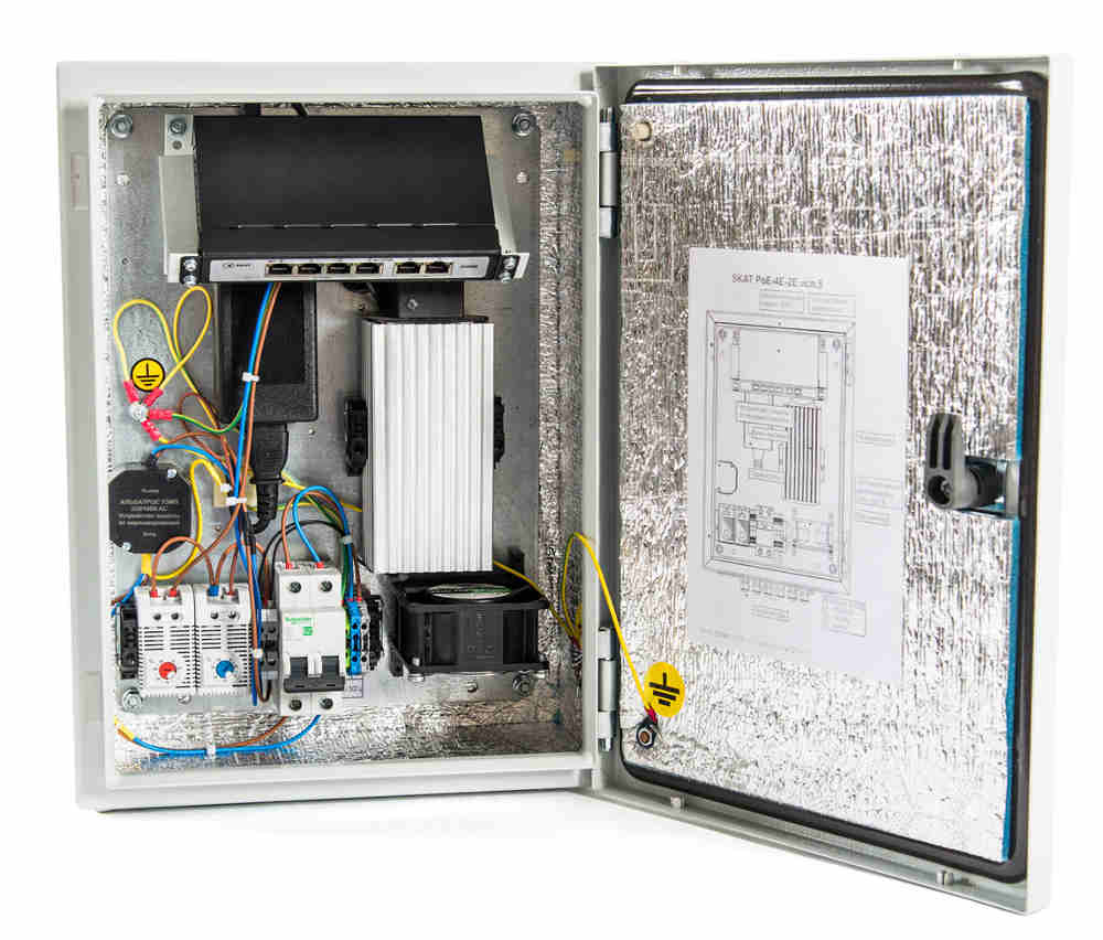 SSKAT PoE-4E-2E исп.5 оснащен системой термостабилизации с помощью термостатов, позволяющим поддерживать температуру воздуха внутри корпуса не ниже +5 °С при отрицательных температурах окружающей среды.