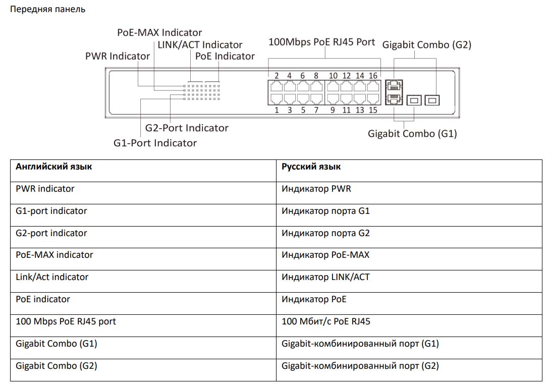 • 16 × 100 Мбит/с PoE RJ45, 2 × Gigabit-комбинированных порта.