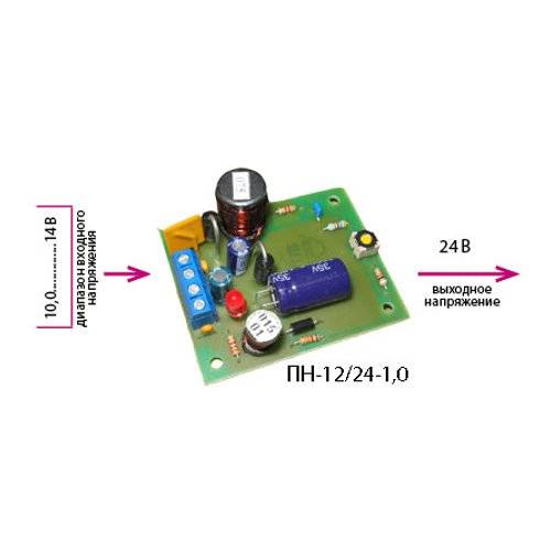 ПН-12/24-1,0 (встраиваемый модуль на печатной плате размером 52х64x30 мм) преобразует нестабилизированное входное напряжение от 10 до 14 В постоянного тока в выходное стабилизированное напряжение 24 В постоянного тока для питания нагрузки с током потребления до 1 А.