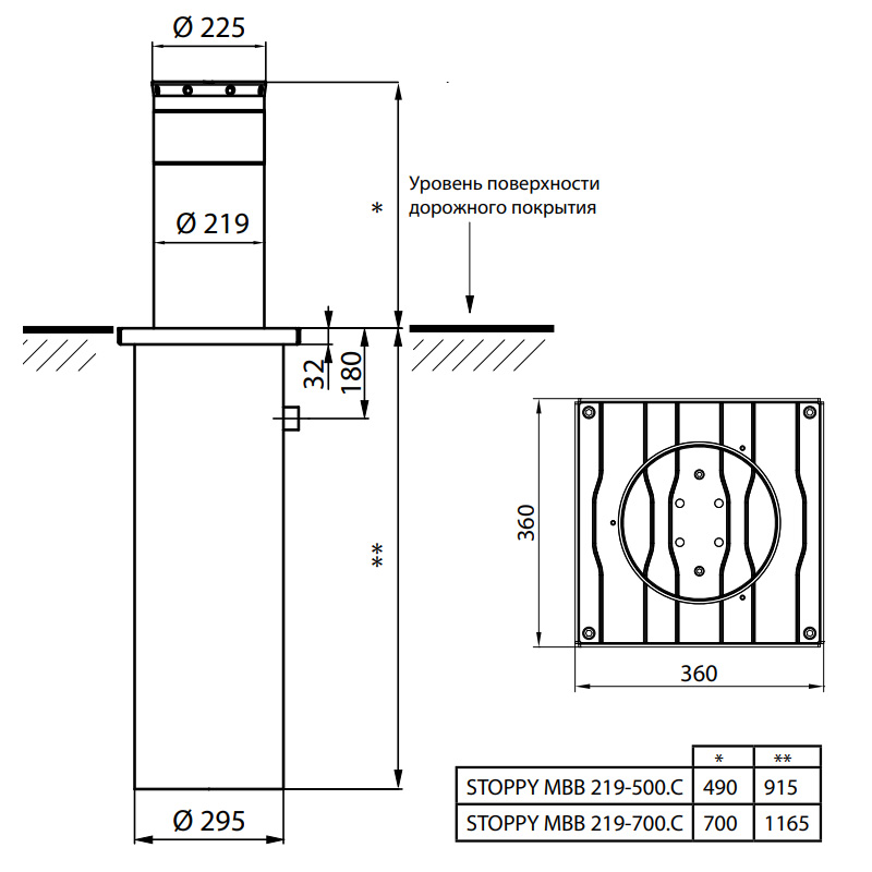 Высота столба составляет 700 мм, диаметр 220 мм., а корпус столба имеет толщину 8 мм. Время полного открытия 6 секунд. Боллард STOPPY MBB обладает свойством ударопрочности до 12000 Джоулей. Работоспособность использования равна 2000 рабочих циклов в сутки.