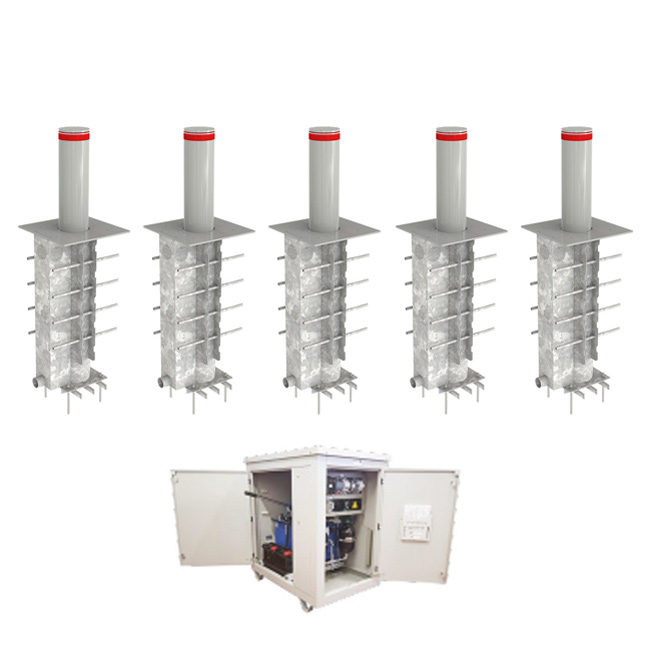 • Электропитание: Стандартная сеть 380 В перем. тока, 3 ф., 50/60 Гц, двигатель мощностью 1,1-11 кВт (в зависимости от количества боллардов в комплекте и включенных принадлежностей). Опционально предусмотрена работа с напряжением 24 В пост. тока в случае сбоя сетевого питания.