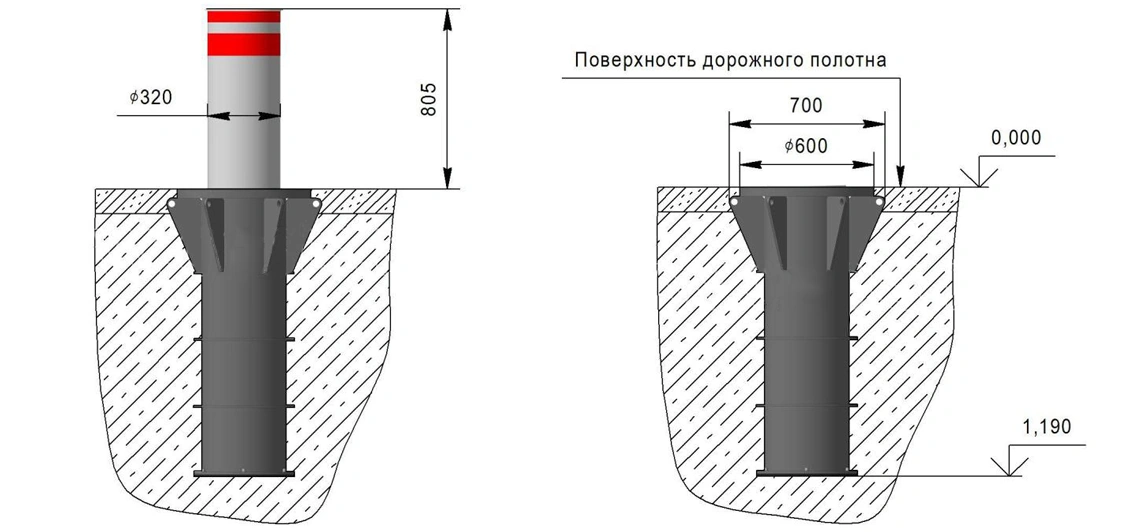 Устойчивость изделия к таранному удару обеспечивается только при его монтаже в железобетонный фундамент. Габариты фундамента и схема армирования определяются проектом, с учетом инженерно-геологических условий местностиНедостатки