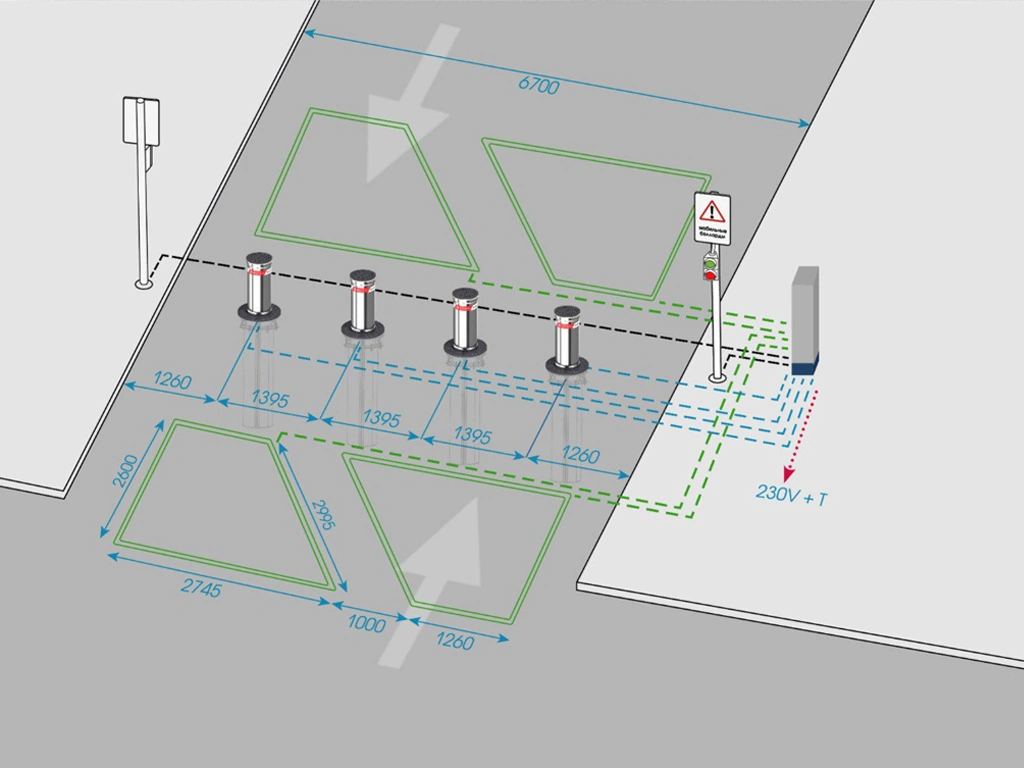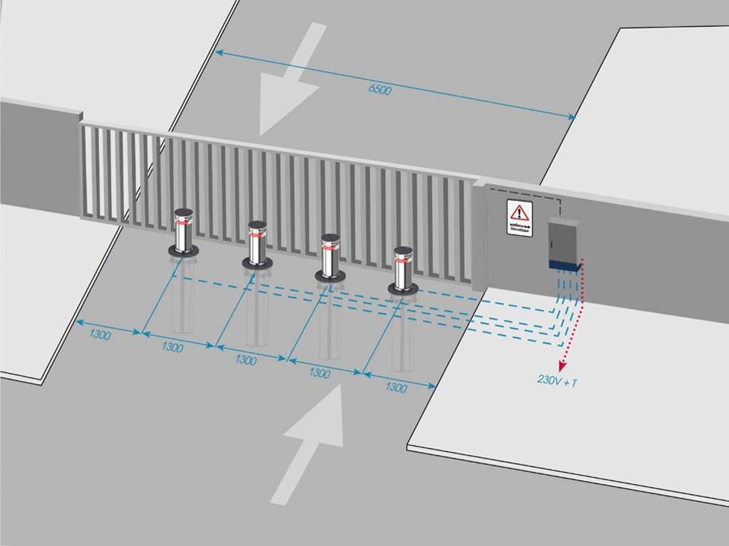 - Достаточный уровень защиты и масштабирование — в зависимости от характеристик автотранспорта на въездную группу ставится от 1 до 4 боллардов P600. Возможно увеличение количества с дополнительным блоком согласования.