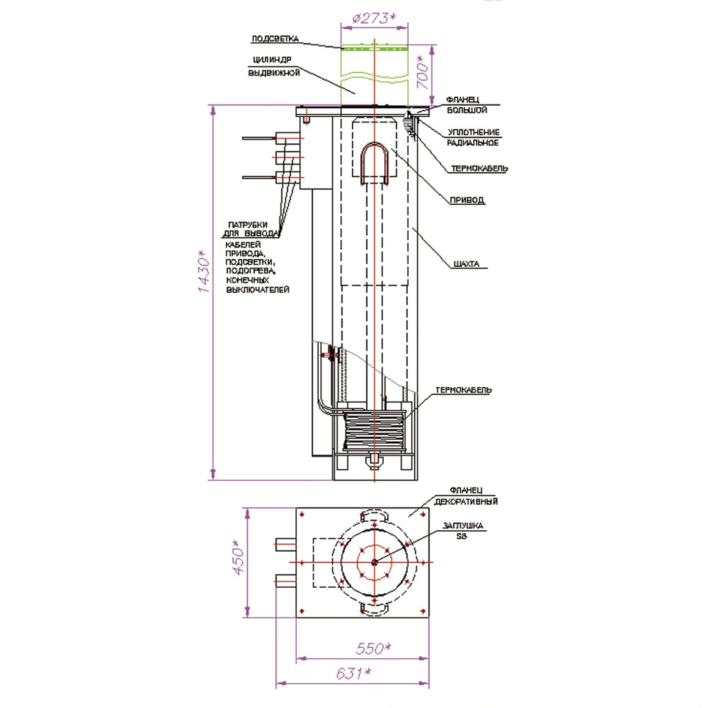 Шахта представляет собой трубу с приваренными к ней фланцем, ручками для переноса и втулками для крепления большого фланца. На боковой стороне трубы расположен карман с патрубками Ø48 мм для вывода кабелей привода, подсветки и подогрева. В нижней части шахты приварено дно с отверстием для крепления актуатора, дренажными отверстиями и пазами для упоров.Приводом является асинхронный трехфазный электродвигатель, который через передачу винт - гайка сообщает движение выдвижному цилиндру. Электродвигатель расположен в верхней части столба.