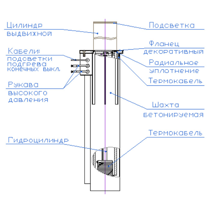 Цилиндр выдвижной является основным блокирующим заградительным элементом, представляет собой гладкую толстостенную трубу, на которую надета тонкостенная рубашка из нержавеющей стали. В верхней части цилиндра выдвижного имеется нержавеющий фланец, под ним располагается светодиодная лента.