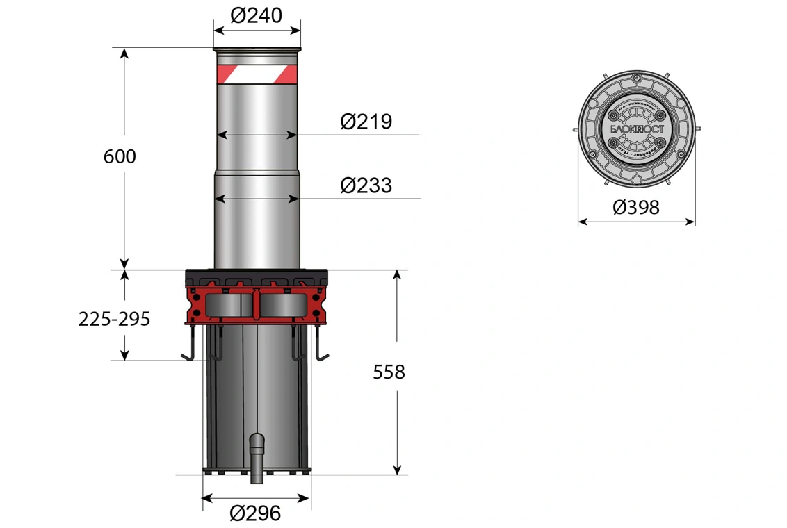 Конструкция болларда выполнена из нержавеющей стали с толщиной стенки не менее 6 мм, что обеспечивает устойчивость к механическим нагрузкам и долговечность эксплуатации. Крышка основания и крышка движущегося цилиндра изготовлены из окрашенного антикоррозийного чугуна. Встроенная система подогрева гарантирует работу при отрицательных температурах, а красная светодиодная подсветка повышает видимость устройства в ночное время. Работает от стандартной сети 220 В и выдерживает до 3 000 000 циклов, что позволяет использовать боллард в условиях интенсивного потока транспорта.