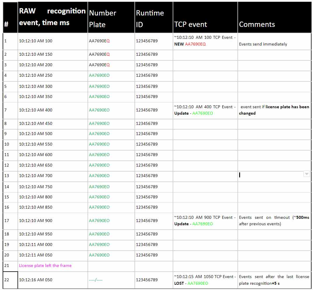 • Пропущенные (lost) события отправляется через 5 секунд, после того как машина покинула кадр