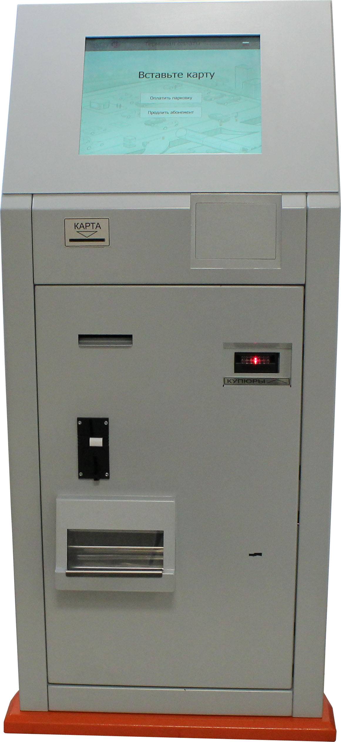 Терминал оплаты автоматически анализирует парковочную карту и рассчитывает стоимость парковки согласно настроенной тарификации для данной парковочной зоны. Он информирует клиента о наличии бесплатного времени, либо необходимости оплаты. После этого автоматическая касса парковочной системы позволяет клиенту оплатить услуги парковки наличными или по банковской карте. Процедура оплаты сопровождается подсказками на экране, что упрощает все действия водителя. Устройство мгновенно проверяет подлинность купюр, при необходимости возвращая их обратно, а также выдаёт необходимое количество сдачи банкнотами и монетами при расчете наличными. После оплаты клиенту предоставляется время для возможности покинуть парковку.