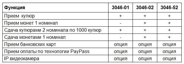 • VAP-3046-02 - Прием купюр. Выдача сдачи – 2 номинала купюр. Приём 1 номинала монет. Выдача сдачи – 1 номинал монет. Recycling монет. Выдача фискального чека. Дисплей – 4 строки по 20 символов. GSM-модем для передачи экстренных сообщений. Усиленная защита купюроприемника, хоппера монет и диспенсера купюр. Диапазон рабочих температур от -40 до 40° С.