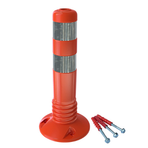 Гибкий дорожный столбик изготавливается из термопластичного полиуретана, который при наезде транспортных средств обеспечивает оперативный возврат изделия в исходное положение без заломов при минусовых температурах. На корпусе столбика нанесена горизонтальная разметка из световозвращающей пленки, полосы нанесены по две штуки в горизонтальном порядке. Столбик крепится к дорожному покрытию с помощью анкерных болтов, которые входят в комплект поставки. Глянцевый красно-оранжевый цвет фокусирует внимание водителей на дорожном ограничителе.