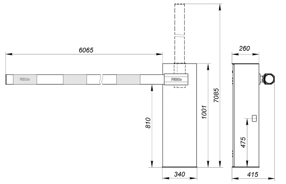 - шлагбаума с поднятой стрелой GBR6.3: 415×340×7085 мм