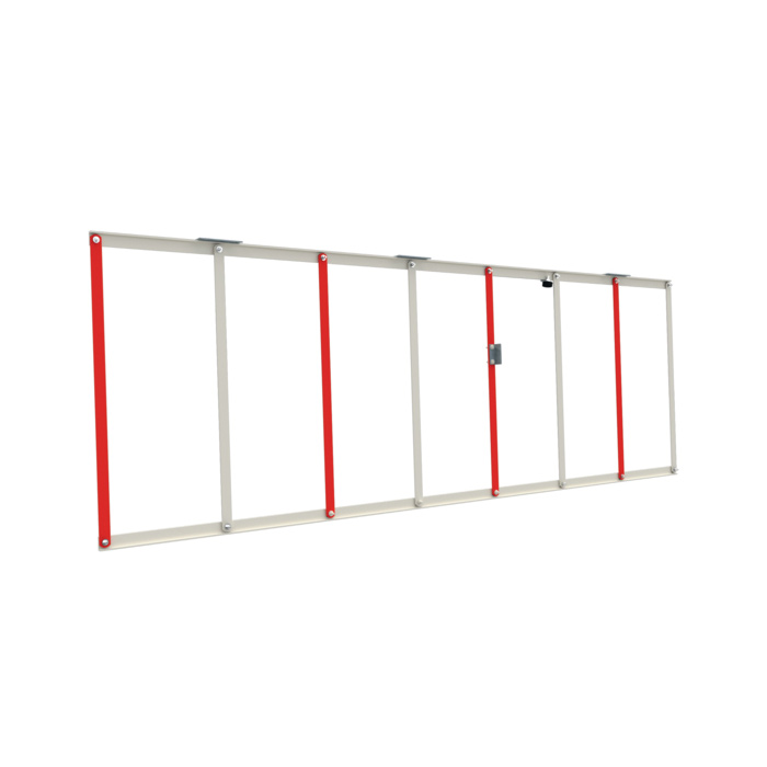 Шторка под стрелу изготовлена из алюминиевых планок, окрашенных в красный и белый цвет, что представляет собой дополнительную сигнализацию и выделяет шлагбаум среди окружающих предметов и строений.