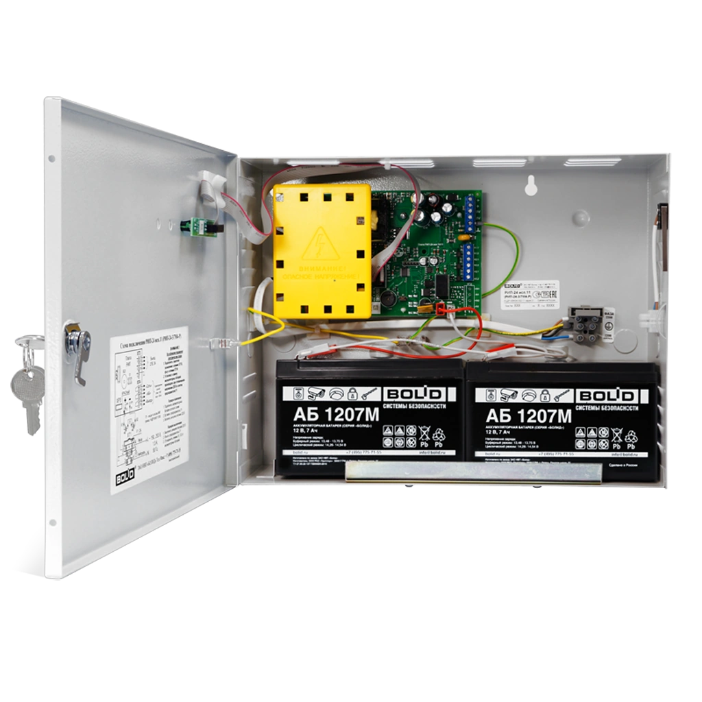 - Резервный источник питания: батареи серии «Болид» АБ 1207 (С, М)* или аналогичные, 12В, ёмкость 7 А∙ч: 2 шт.