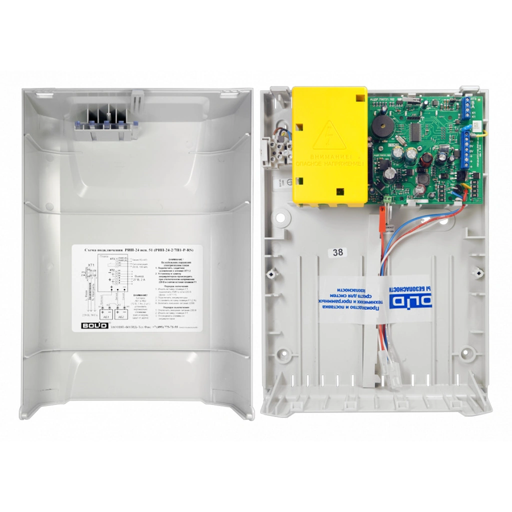 Используются две герметичные свинцово-кислотные батареи 12 В, 7 А·ч. РИП автоматически заряжает АБ, периодически контролирует их состояние и цепи подключения, ведёт учёт наработки и поддерживает измерение фактической ёмкости. При падении напряжения на батареях ниже 22 В подаётся ускоренная предупредительная звуковая сигнализация; при достижении 20,4 В АБ отключаются от нагрузки для предотвращения глубокого разряда. Эти функции позволяют заранее планировать замену аккумуляторов и гарантировать работу системы в резервном режиме столько, сколько требуется по проекту.