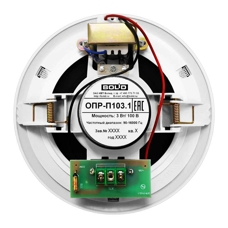 Оповещатель выпускается для подключения к линии оповещения с номинальным напряжением 100 В. Подключение к линии оповещения производится через клеммы с креплением «под винт».