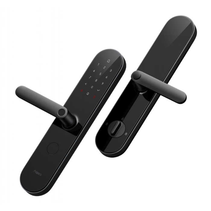 Aqara N100 (Zigbee) — умный замок, поддерживающий отпирание двери при помощи отпечатка пальца, пароля, NFC, аварийного ключа и HomeKit. Считыватель отпечатков пальцев встроен в ручку и реагирует мгновенно.