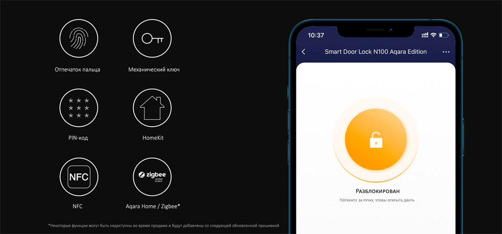 • Способы открытия: Отпечаток пальца, пароль, временный пароль, механический ключ, Bluetooth, NFC, HomeKit, ключ Apple home, удаленная разблокировка, периодический пароль, Google Assistant