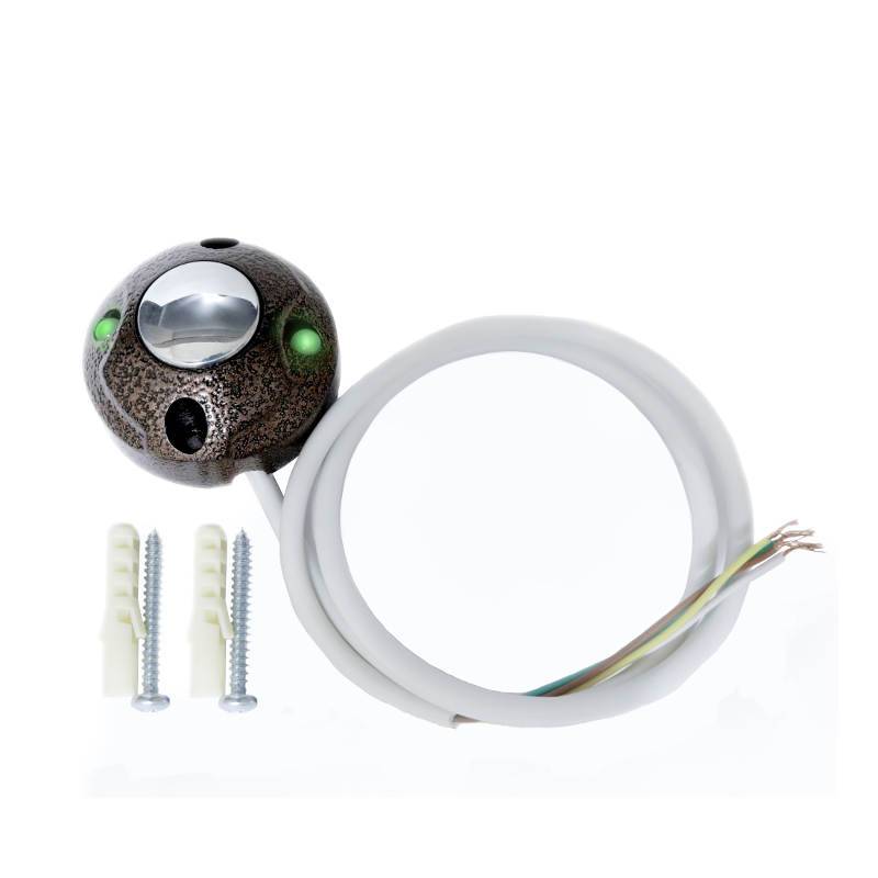 Кнопка отлита из цинкового сплава и имеет антивандальную конструкцию. Подсветка из двух светодиодов позволяет найти кнопку в полной темноте. При смене полярности питания цвет подсветки меняется с зелёного на красный.