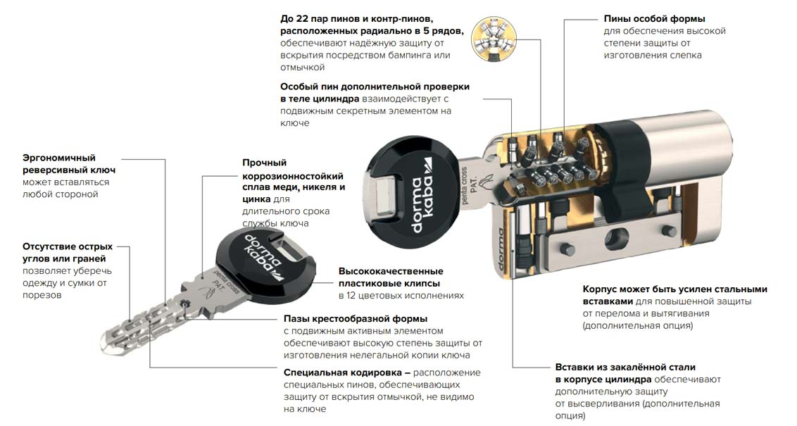Система с реверсивным профилем ключа penta cross от dormakaba сочетает непревзойденную безопасность, высочайший уровень защиты от нелегального изготовления копии ключа и исключительное удобство использования. Универсальность системы, позволяет как запирать отдельные двери, так и использовать ее в системах под один ключ или мастер-системах высокой сложности, делает ее оптимальным решением для организации доступа в здания любого формата — не только частные дома и жилые комплексы, но и в общественные здания и на промышленные объекты.