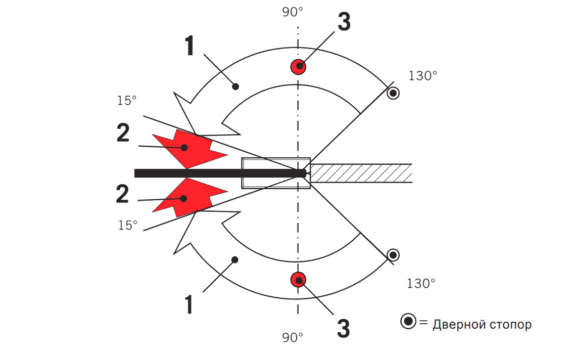 ** Максимальный угол открывания – 130°. Если есть возможность открытия двери более чем на 130°, необходимо использовать дверной стопор.