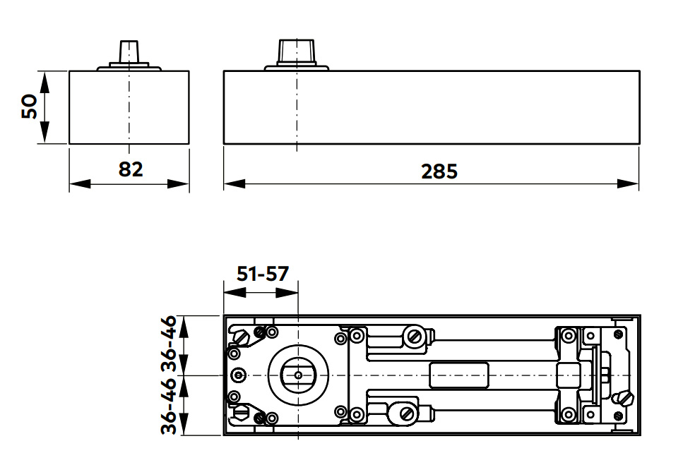 Универсальный напольный доводчик, удовлетворяющий стандарту DIN EN 1154 и ГОСТ Р 56177-2014 для левых, правых и маятниковых дверей весом до 120 кг. С независимо регулируемыми начальной скоростью закрывания, дохлопом и усилием закрывания (EN 1-4).
