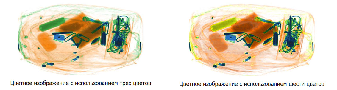 Расширенная цветовая палитра отображения разделяет объекты на изображении по шести цветам в зависимости от атомного числа и плотности, позволяя оператору эффективно обнаруживать угрозы.