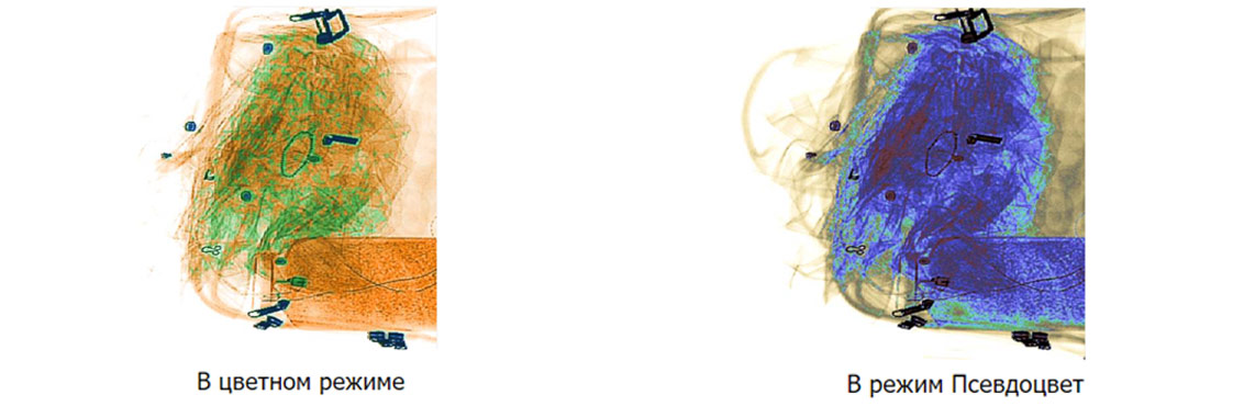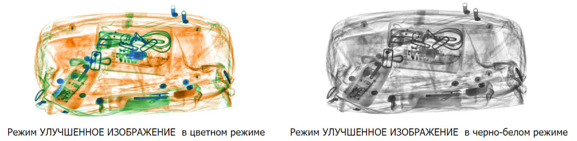 • Вывод изображения досматриваемых объектов в 6-ти цветах, в зависимости от атомного числа. 6-ти цветное отображение облегчает оператору идентификацию материалов досматриваемого объекта и ускоряет саму процедуру досмотра