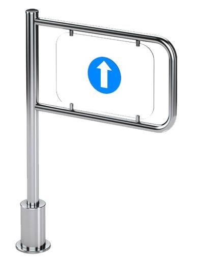 Все элементы конструкции калитки выполнены из шлифованной нержавеющей стали. Створка калитки крепится к стойке при помощи установочных винтов. Стойка вращается относительно неподвижного основания, прикрепленного к полу.