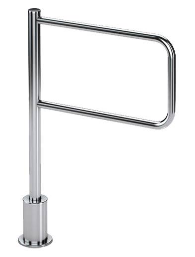 Все элементы конструкции калитки выполнены из шлифованной нержавеющей стали. Створка калитки крепится к стойке при помощи установочных винтов. Стойка вращается относительно неподвижного основания, прикрепленного к полу. Крепление к полу скрывает крышка основания.